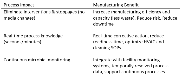 LIF has the greatest potential to directly improve manufacturing processes when used for in-process environmental monitoring of the aseptic core. LIF instruments can replace active air samplers, settle plates, total particle counters or all three methods. LIF microbial detection instruments are used as a part of an automated facility monitoring system in these applications, which takes full advantage of real-time, continuous microbial data to impact and benefit manufacturing processes in several ways. Table 1 outlines the major impacts of replacing traditional method for environmental monitoring of the aseptic core.